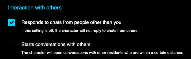 Unresponsive Character? If your character’s not responding with you, give it a few seconds. If others, double check that the setting “Responds to chats from people other than you” is selected.